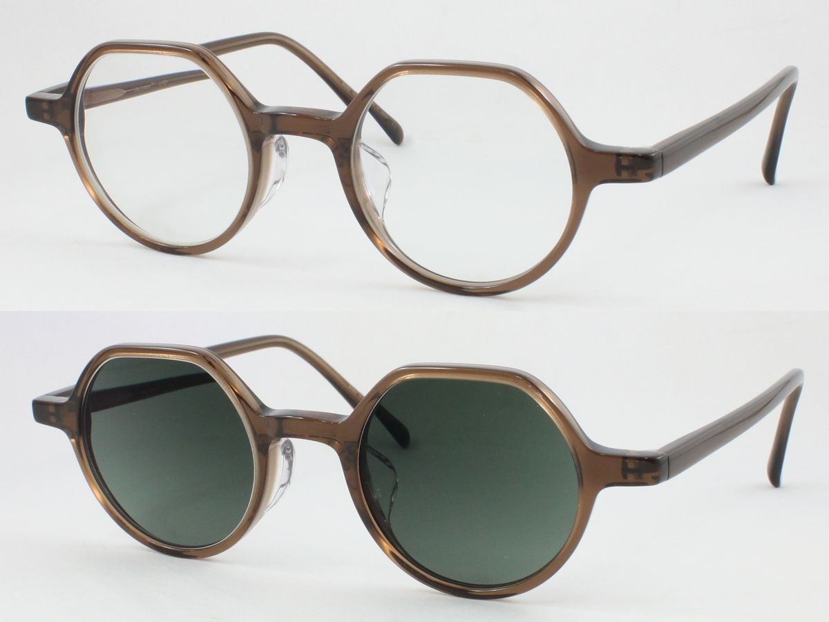 丸メガネのイメージのジョンレノンでは珍しいクラウンパント型のデザイン。個性的なメガネを複数お持ちで今回はその1本に仲間入り。レンズは可視光調光レンズのHOYAセンシティダークのグリーンで作製。手元の度数はやや弱めにし装用感を重視。